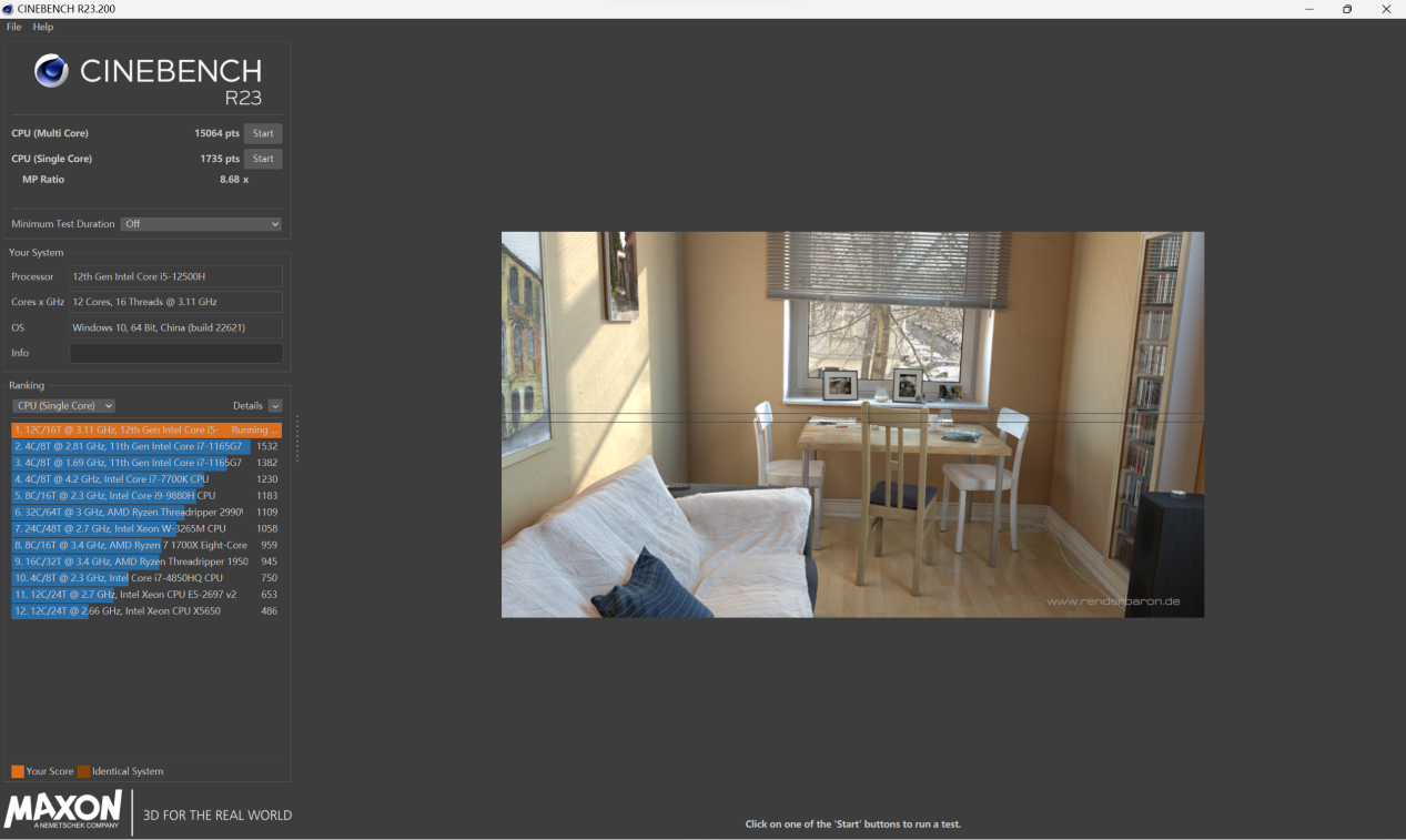 在R23中,则达到了单核1735分和多核15064分,i5-12500H相比上代同样有着不小的提升,在笔者看来,对于游戏玩家们来说i5-12500H就够了。
