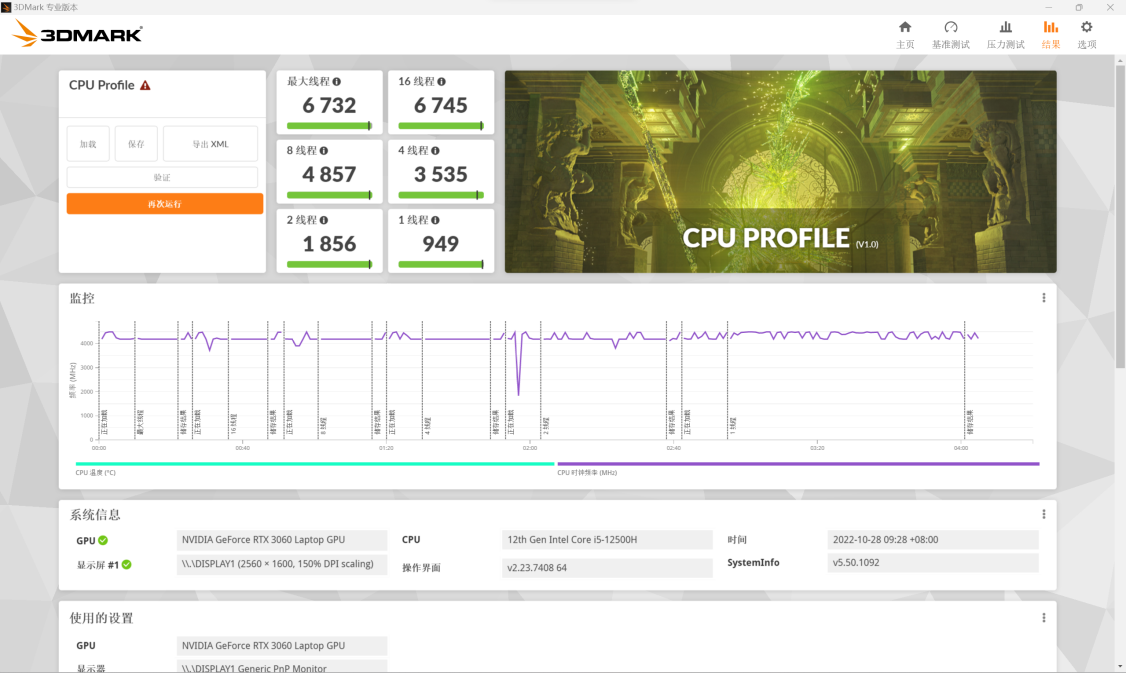 最后我们测试一下3DMarkCPUProfile,多核分数达到了6745分,单核则为949分,表现出色。