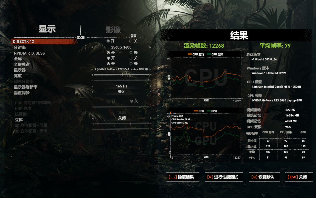 接下来我们测试几款3A大作。画质全部开到最高,有DLSS就开到平衡档再进行测试。首先是跑分常客《古墓丽影:暗影》,开启最高画质后,它可以实现平均79帧,畅玩完全没问题。