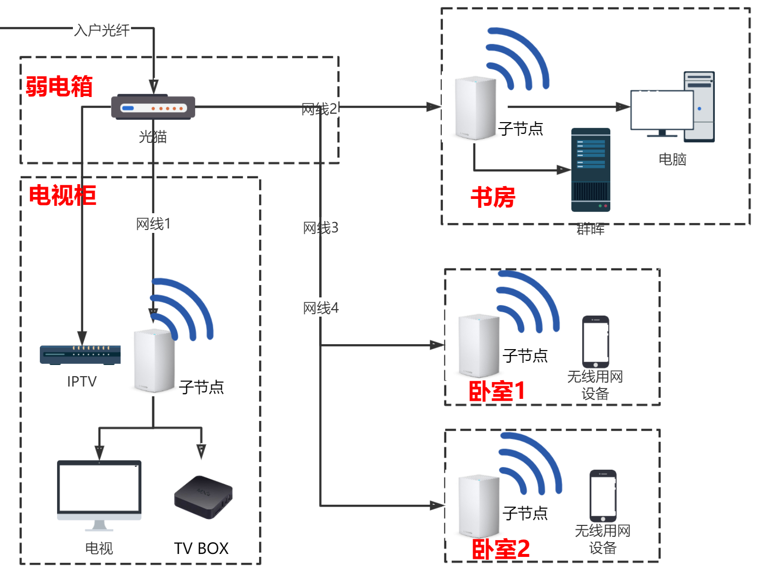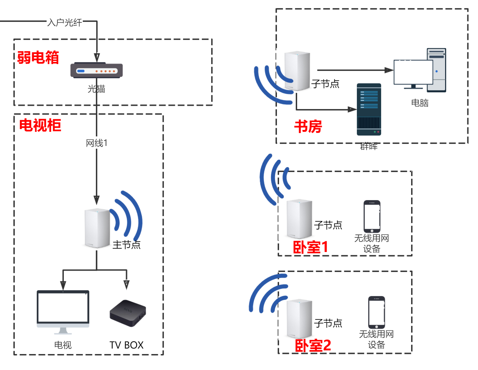 卧室放一个子节点,为房间提供无线网络。