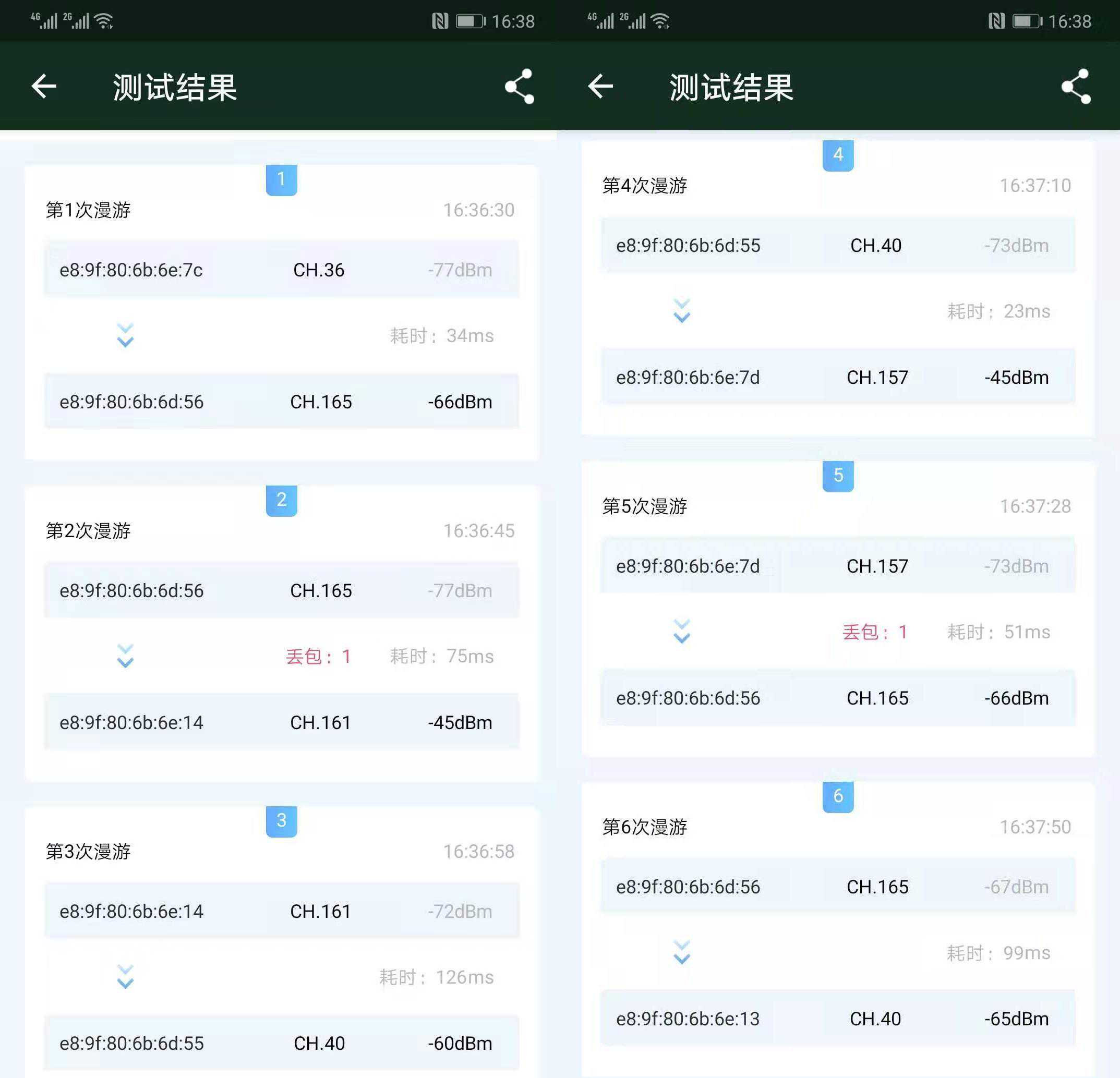 使用WiFi魔盒,在三个节点间来回走动,测试期间共发生6次漫游,切换耗时基本都在100ms以内,可以说是漫游切换非常快了。不过领势的切换发生的相对比较晚,只有在信号强度很低的时候才会切换,多少对于网络使用有点影响。