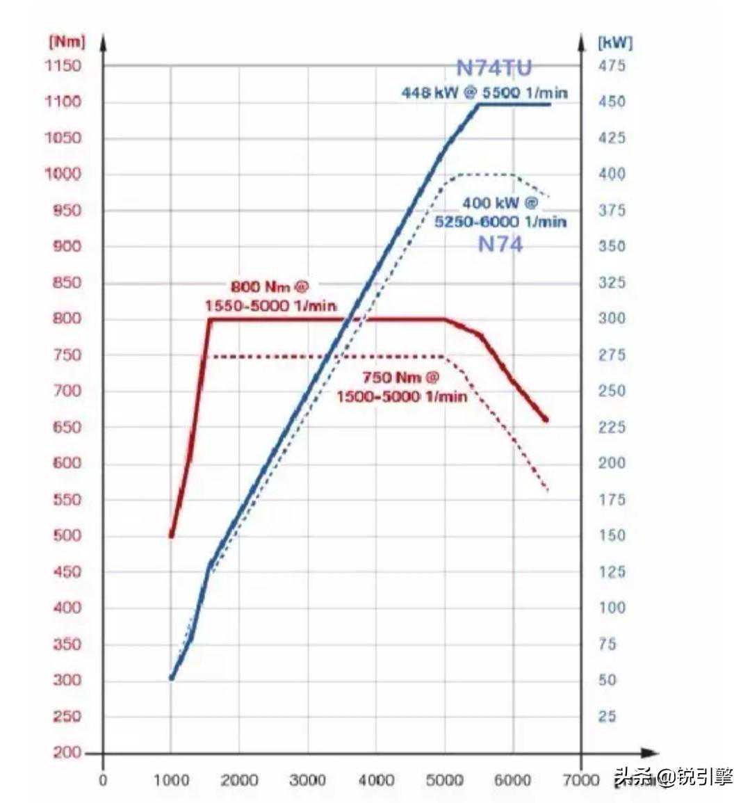 N74TU的性能:最大功率446千瓦,峰值扭矩800Nm,下图中可以看到比之前的N74有较大的提升,但是,其实最新M8雷霆版上采用的S63发动机高功率版本的功率已经达到460千瓦的水平,这意味着宝马性能最强的发动机是V8而不是V12了。从宝马内部目前定位来看,这台V12更多是王者地位的象征,不会进一步提升性能了。