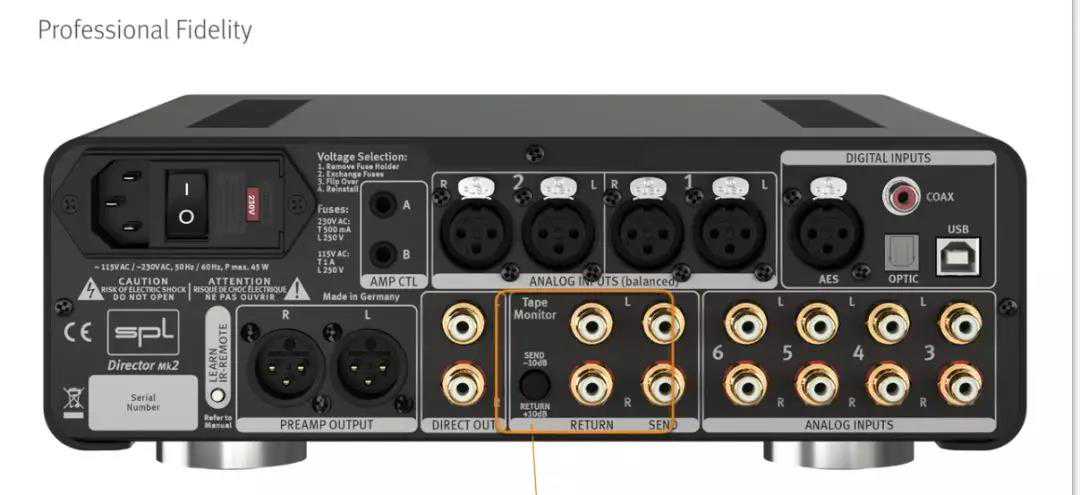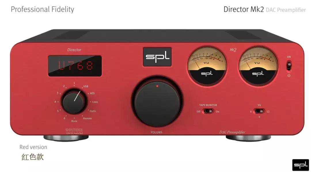 全新的DirectorMk2高伏特数字模拟转化器现在支持32bit和768kHz的采样率。偏爱模拟磁带机或外部音频设备处理的用户可以将他们钟爱的设备插入TapeMonitorLoop插口。现在共有6路模拟输入。其中的2路为平衡XLR接口。现在整个机身高度有了一定的提升,为大个头且带有LED显示的铝制音量控制钮和机械式的VU量表留出了足够的空间。