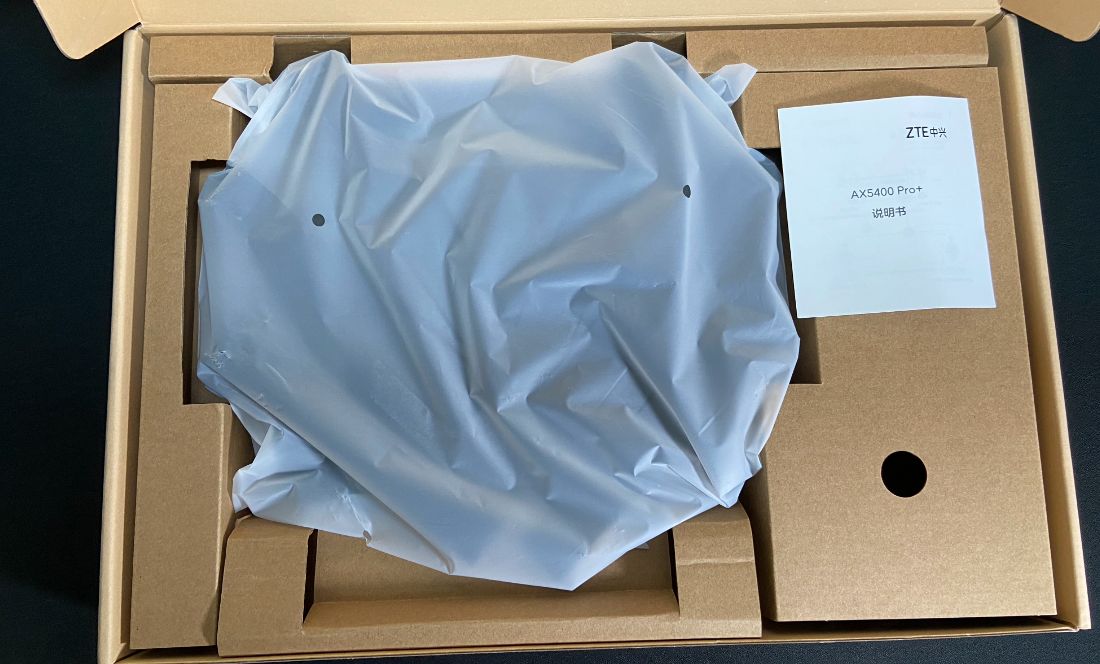 路由器打开盒子可以看到路由器紧紧的卡在盒子里面,防止在运输过程中晃动摔坏,路由器的配件相对简单,一个电源适配器和一根网线,还有一本说明书。