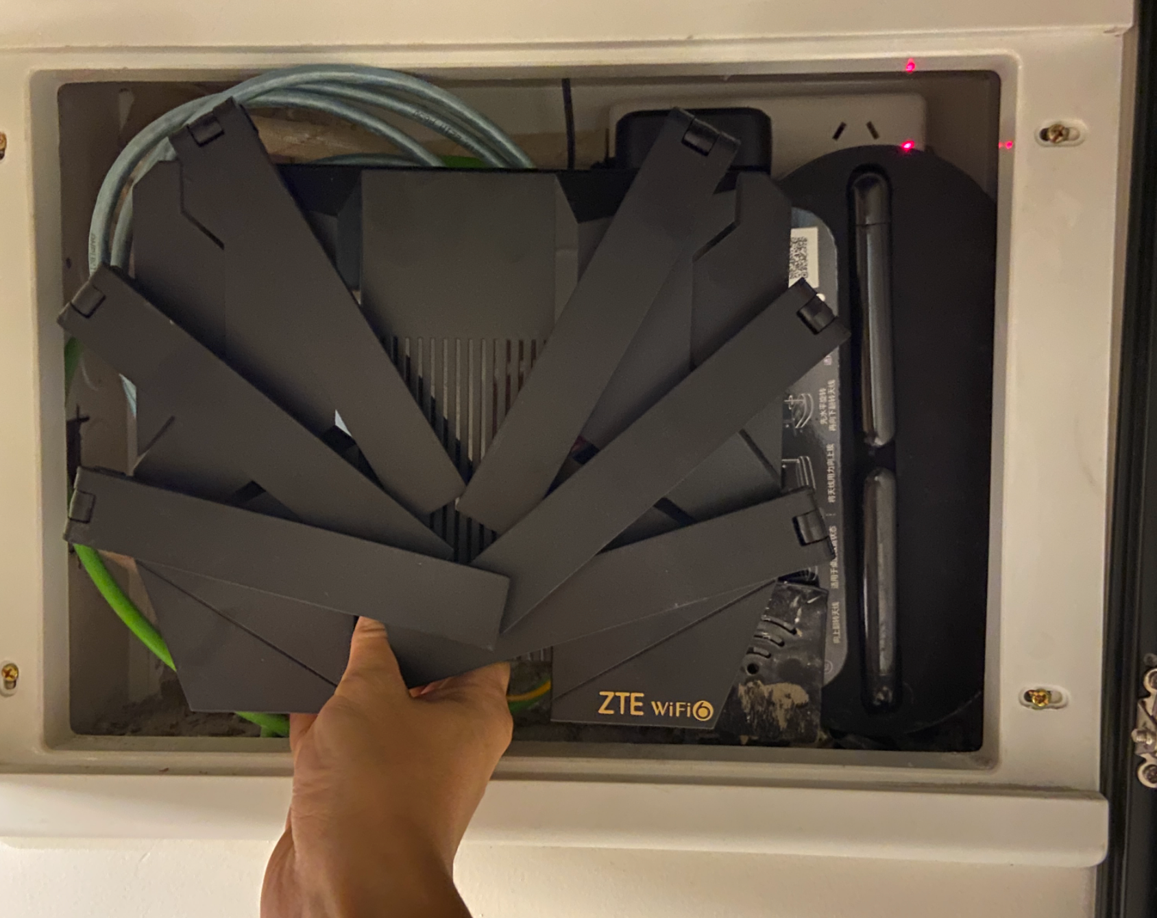 一开始本来是想着使用这个年度最强路由器作为主路由器,然后用它来拨号,榨干运营商给的每一点带宽,只可惜这路由是个巨无霸光它一个就能占满整个弱电箱的空间,光猫就无处安放了,弱电箱的盖子也盖不上。