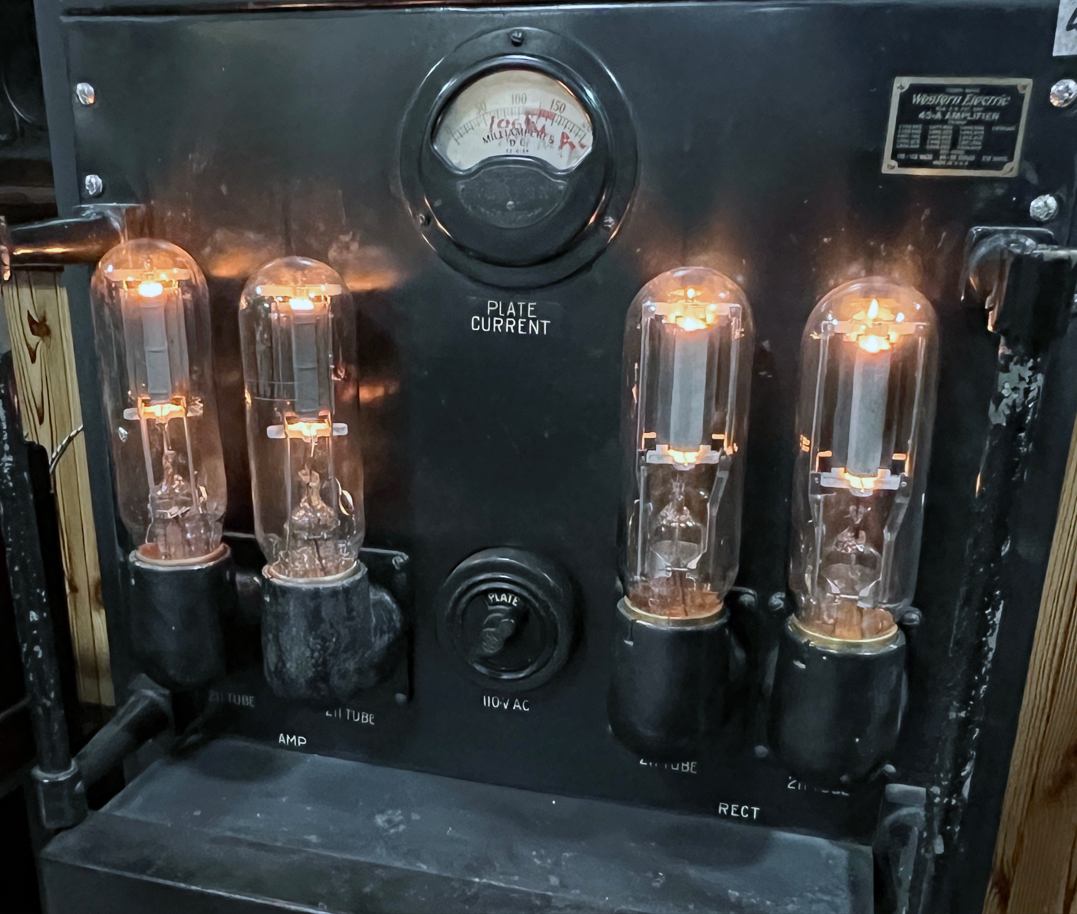 非常罕见的WE59B功放,由于使用汞气整流管,通电时会发出神秘蓝色光芒。汞气整流管通常用在高电压,特点是内阻低,声音非常好,但最大问题是要先预热灯丝才能送入交流高压,否则容易打火,使用上有点麻烦