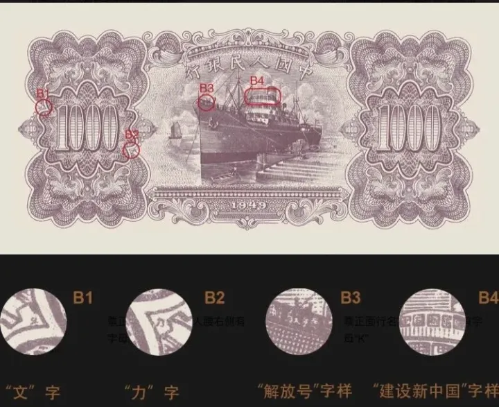 B1:票券背面左侧1000左上角(如图)中有汉字“文”字暗记;