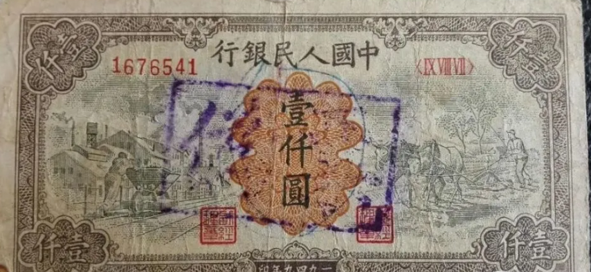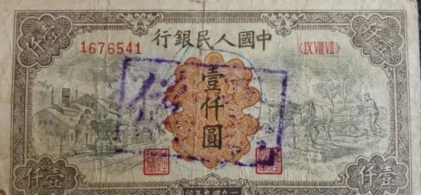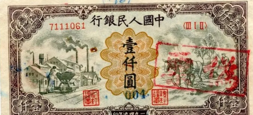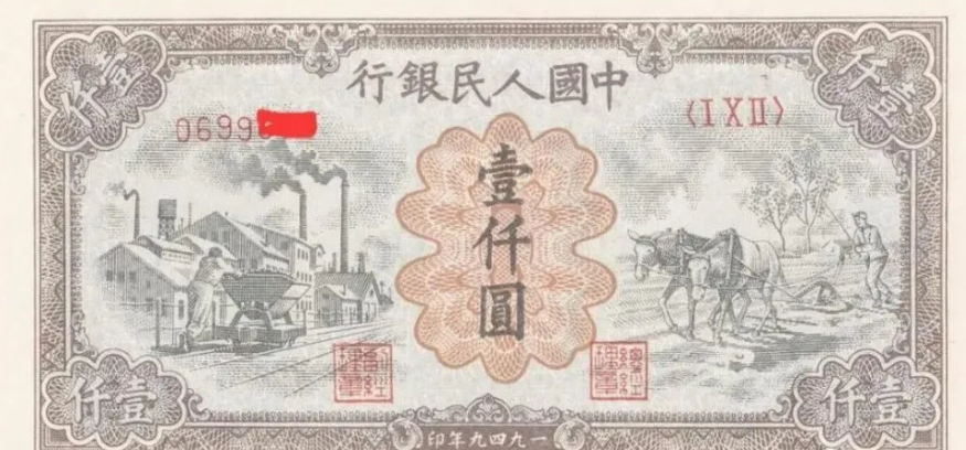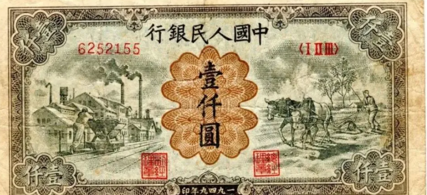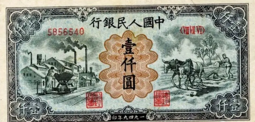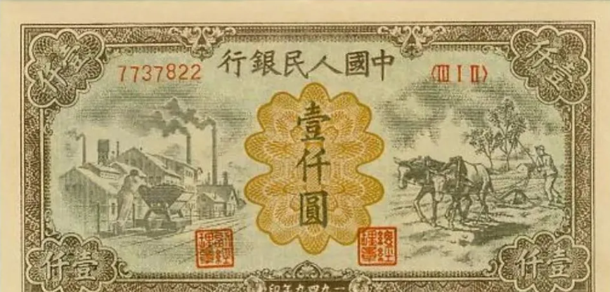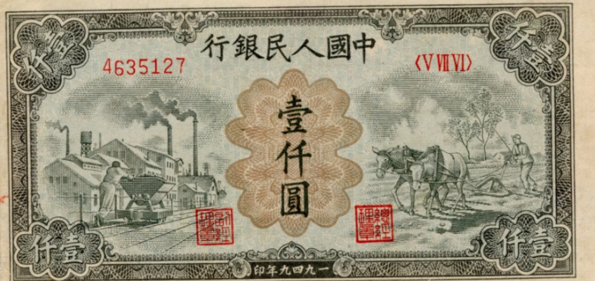 第一版人民币壹仟圆运煤与耕田正面