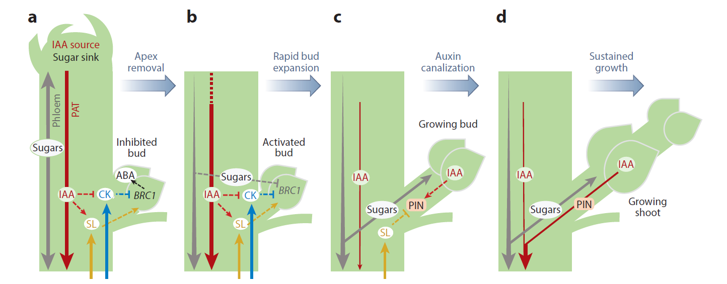 生长素运输渠化假说可以解释芽生长的第二阶段。PAT中IAA的消耗可促进生长素从芽中被动流出。这种外排可导致PIN蛋白在流出方向上的上调与极化。从而建立起生长素从芽至茎的运输通道。这种生长素的输出被认为是芽生长所必需。拟南芥SL信号的一个重要功能可能是诱导网格蛋白介导的PIN1内吞来消耗茎细胞质膜上的PIN1生长素外排蛋白。这阻碍了生长素从芽向茎通道化运输的建立,并抑制芽生长成为侧枝。持续的IAA输出导致维管的形成,为支持持续生长所必需(图5)。然而,当植物环境发生变化时,如侧枝生长减慢或被阻碍,则生长不一定被维持。因此,侧枝的生长和枝条构型对环境条件高度敏感。