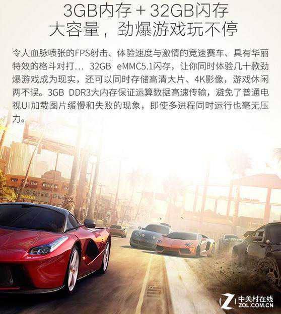 乐视超4X55具有巨大性能优势的Mstar6A938芯片,搭载ARM全新A72架构CPU,旗舰GPUMaliT820,具备一流的运算速度和图形处理能力,支配着超级电视做出迅速响应。让用户拥有清晰流畅的观影体验,感受震撼的画面和迅捷的操作体验。32闪存,让你同时体验几十款劲爆游戏成为现实,还可以同时存储高清大片、4K影像,游戏休闲两不误。3GBDDR3大内存保证运算数据高速传输,避免了普通电视UI加载图片缓慢和失败的现象,即使多进程同时运行也毫无压力。