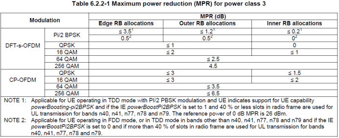 5GNR允许终端在特定的调制方式、特定的RB分配机制下,适当回退最大发射功率,以适应高阶调制带来的发射指标超标或者占用带宽超标的问题;