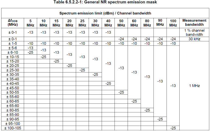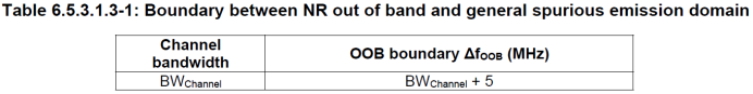 这里的发射杂散是通用的发射杂散,和LTE的要求非常类似,是outofbandemssions之外的频谱要求。具体指标要求如下: