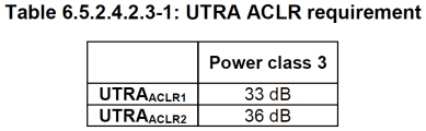 和LTE类似,5GNR也有相应的对UMTS(WCDMA和TD-SCDMA)的邻道干扰的指标,ACLR1指的是5G信道边缘±2.5MHz,ACLR2指的是5G信道边缘±7.5MHz。