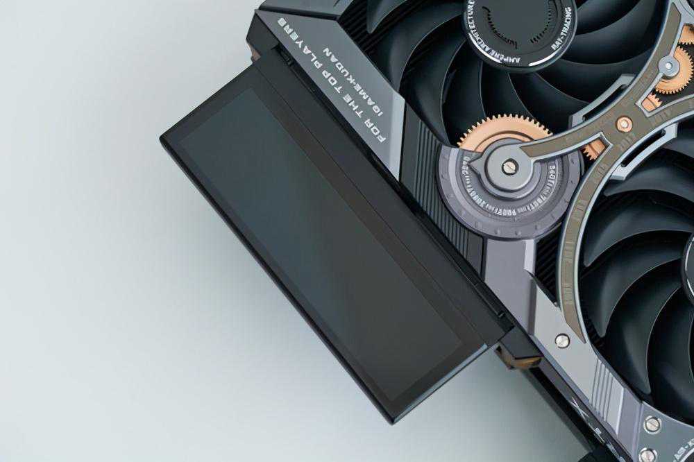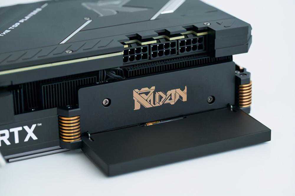 上一代的Kudan显卡虽然也有配置彩屏,但那个屏幕是固定的,不能改变显示角度,而iGameRTX3090Kudan显卡则是考虑到了竖装显卡的需求,把彩屏改为了可上翻式设计,这样在竖装显卡时就不会看不见屏幕显示的内容了,而且翻开后还可以看到其背后有Kudan的标志。