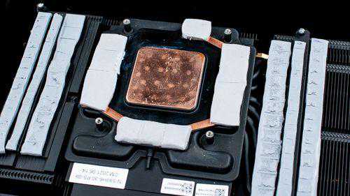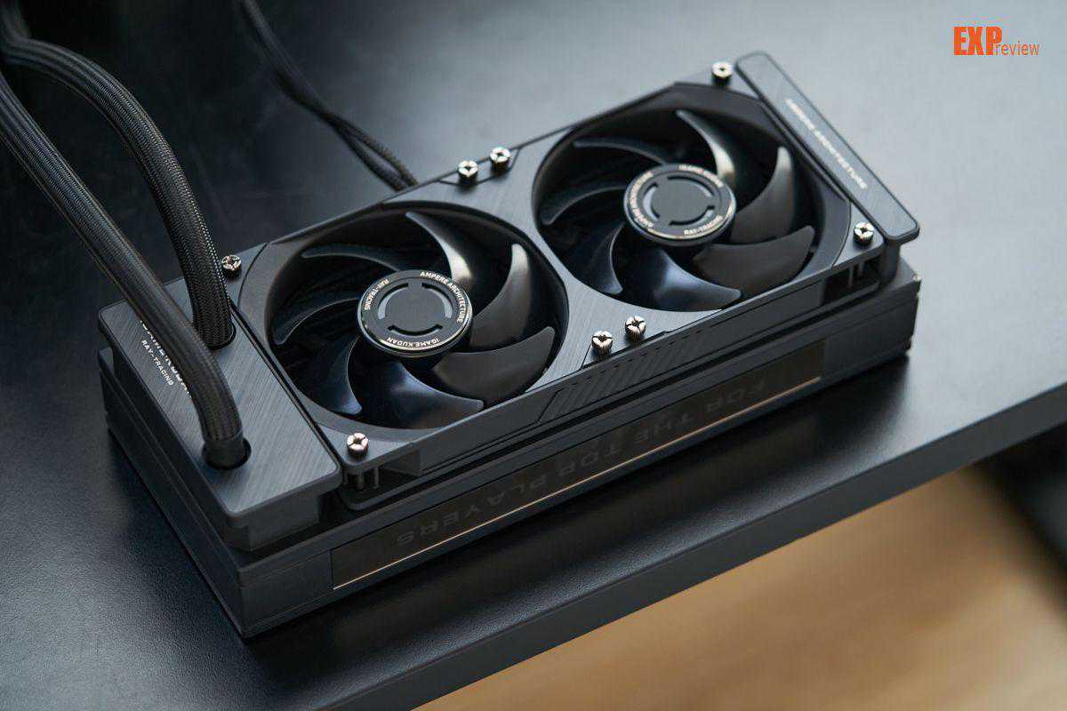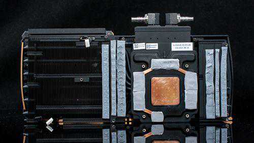 首先我们来看看显卡的散热器,底座采用的是真空均热腔结构,搭配6根6mm纯铜热管,水冷头覆盖底座与热管,因此即便不接上水冷也不会影响显卡的风冷散热,供电电路与显存则通过导热垫与显卡散热器结合。