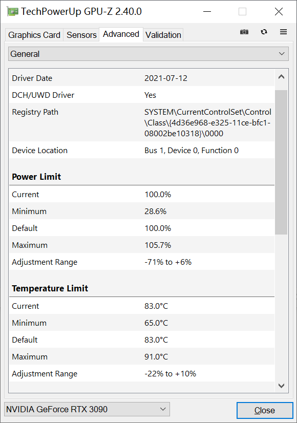 我们可以通过GPU-Z看到显卡的BIOS中有关温度与功耗的相关信息,iGameRTX3090Kudan显卡具备双BIOS功能,可以通过I/O挡板上的按钮实现一键切换(切换后需要重启PC才可应用新BIOS),其中常规BIOS下的核心基础频率为1395MHz,Boost频率为1695MHz,显存数据频率为等效19.5Gbps,默认的温度上限是83℃,可以向上解锁至91℃,默认TDP上限是350W,最高可解锁至370W。