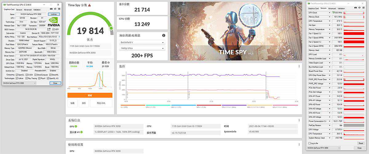 超频测试:巅峰之上还能再进一步最后是显卡的超频测试,测试时显卡使用超频BIOS和风水冷混合散热模式,风扇转速手动调整至100%满速,温度和TGP限制提升至上限,最终在显卡核心频率+140MHz,Boost频率最高可达2130MHz,显存数据频率超频至22Gbps的情况下成功通过3DMarkTimeSpy测试。