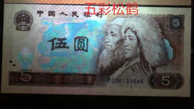 存在于PB,PD,PF,PG,PH,PI,PJ,RA,RB,RC,RD,RE,RF,RG,RH,RI,RJ,TA,TC冠号号码的部分流水中。五彩松鹤唯一补号【ZJ】。五彩苍松比苍松翠鹤发行晚,纸质较苍松略厚,其荧光主要特点是红绿相间,色彩鲜艳。五彩松鹤发行量极为稀少,全新的每张价格在80元以上。