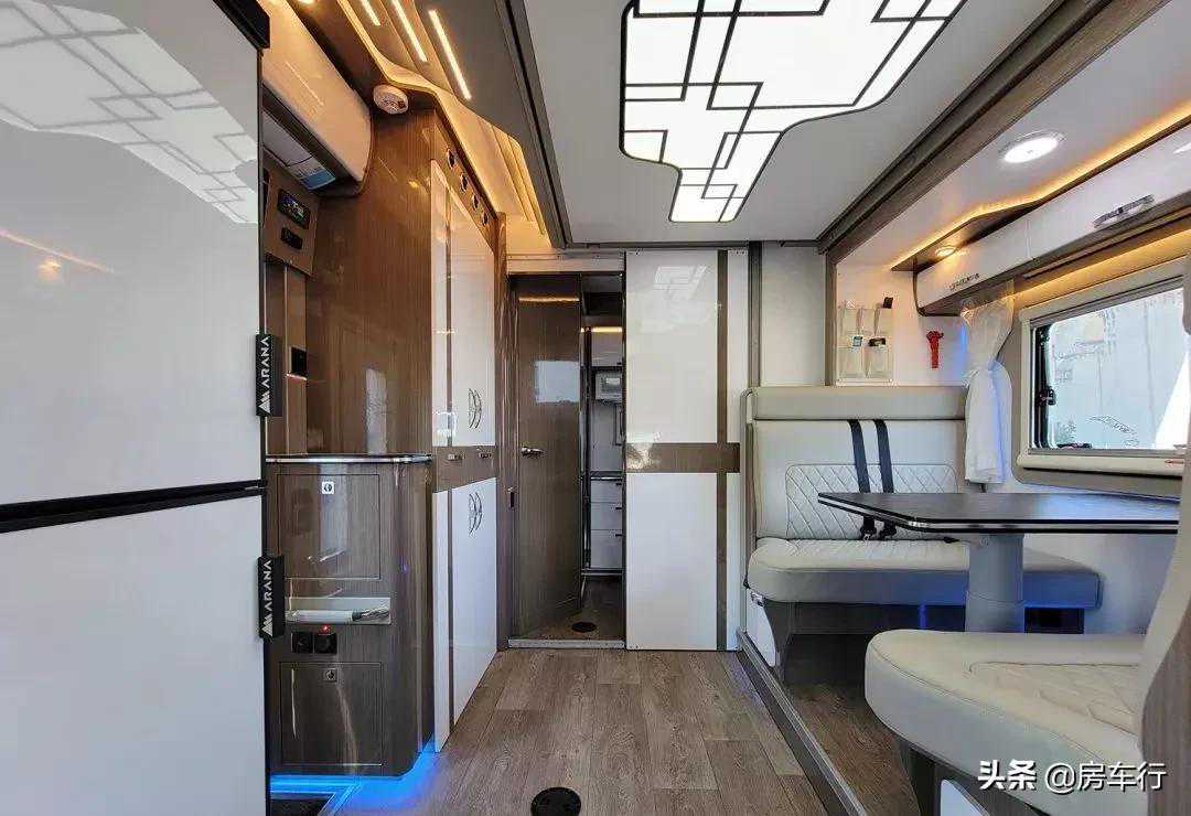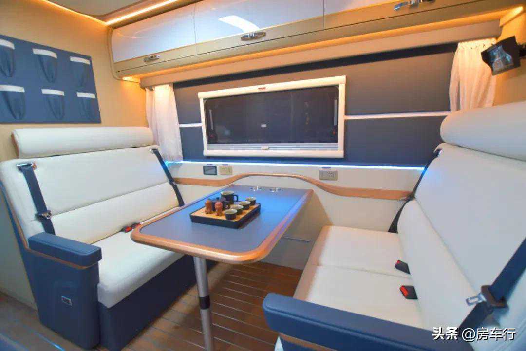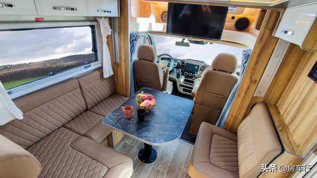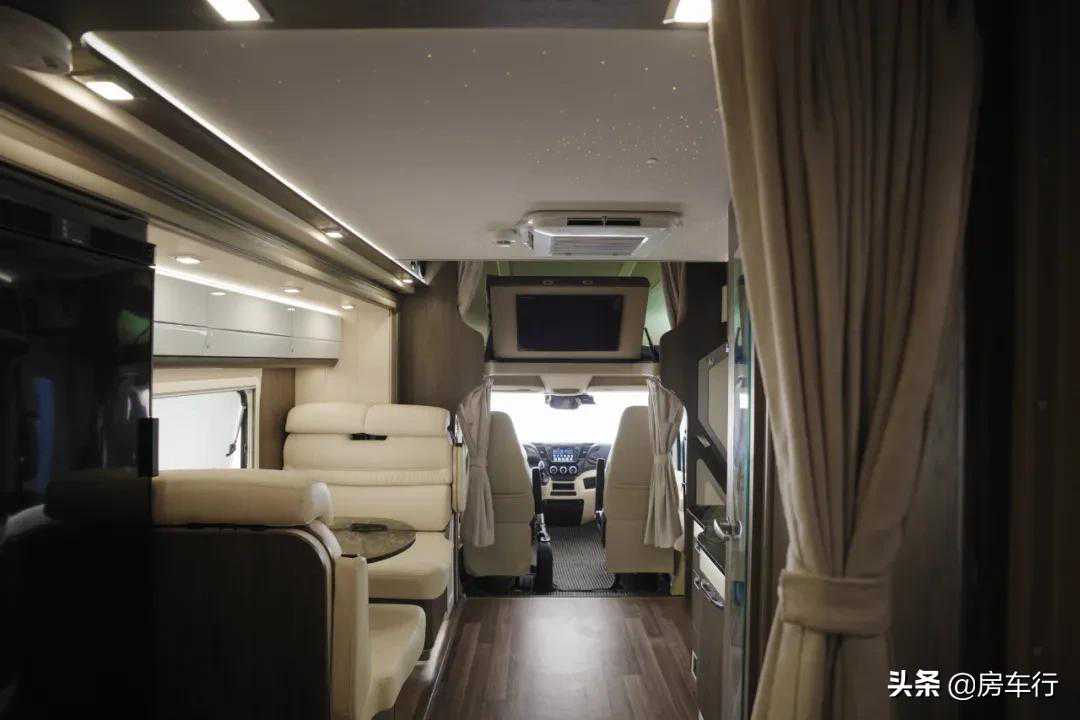生活区场景化星光顶温馨浪漫;行业首创丝印科技面板灯进一步提升整体豪华感;内饰选用进口烟熏橡木板材+条形纹理皮革软装;会客区新造型双人对卡座,皮革包覆,宽面头枕,乘坐起来更加舒适;中间设有气动升降+四向滑移餐桌,并可根据需要组成单人床;