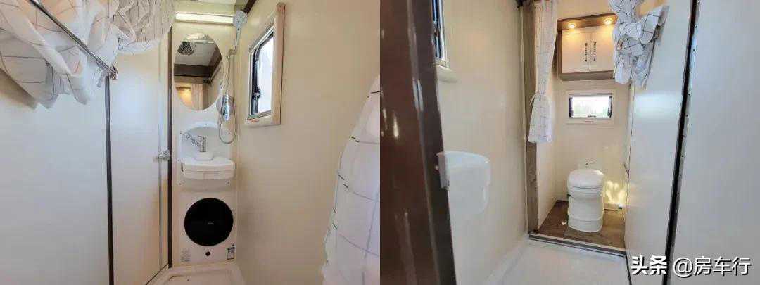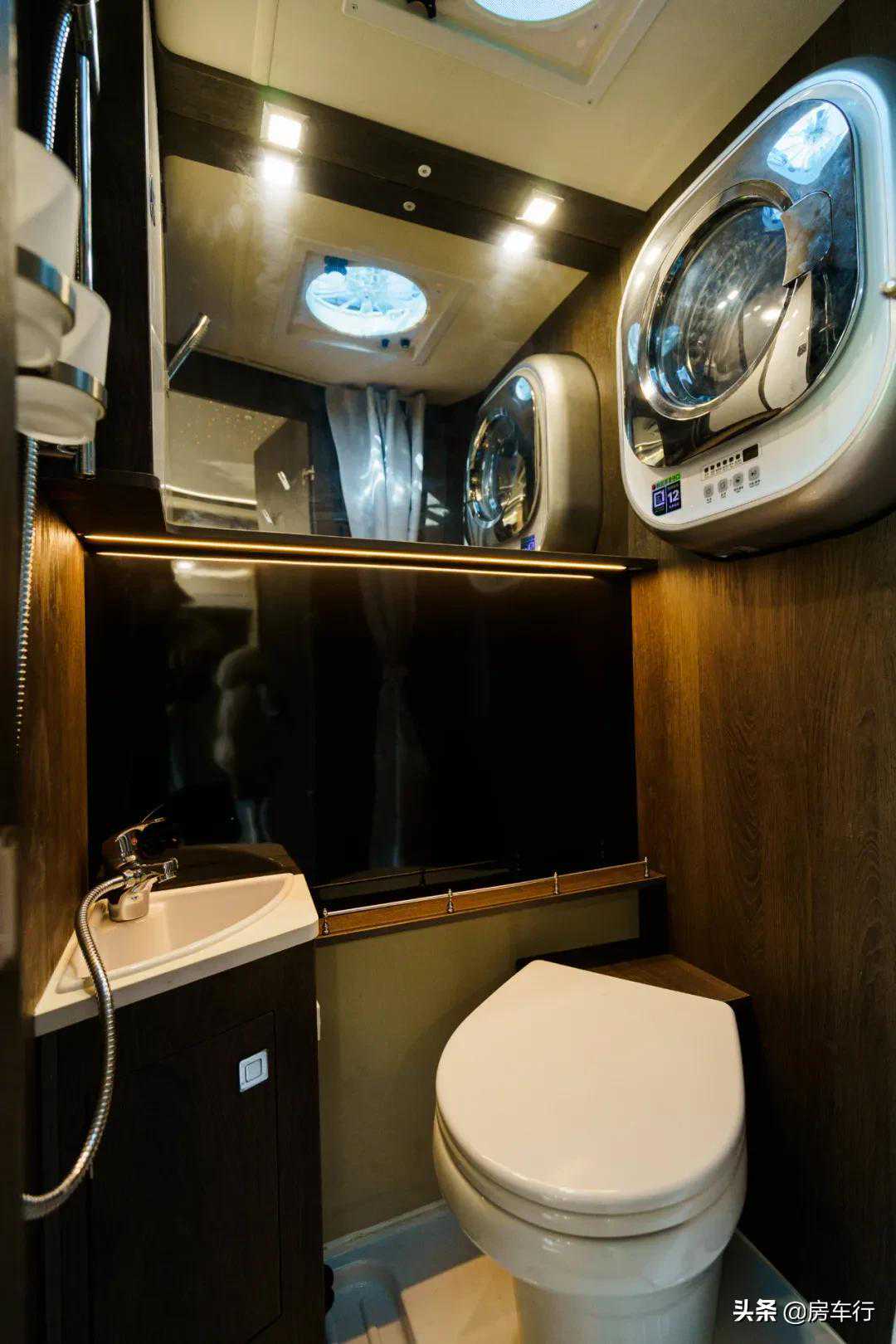 卫浴间一体式设计,配备赛特福德抽拉盒式马桶、独立洗漱池、独立淋浴花洒、镜面柜、换气扇、进口迷你洗衣机等,满足车上人员日常卫浴洗漱需求;
