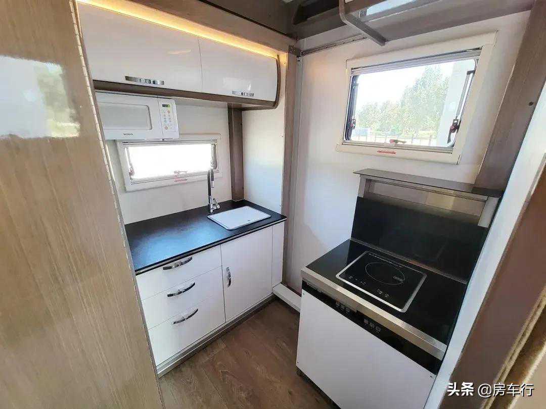厨房区一体式橱柜侧方设有折叠式拓展桌板,并配置了电磁炉、洗菜池、多美达110L冰箱、房车专用抽油烟机、微波炉等设施;