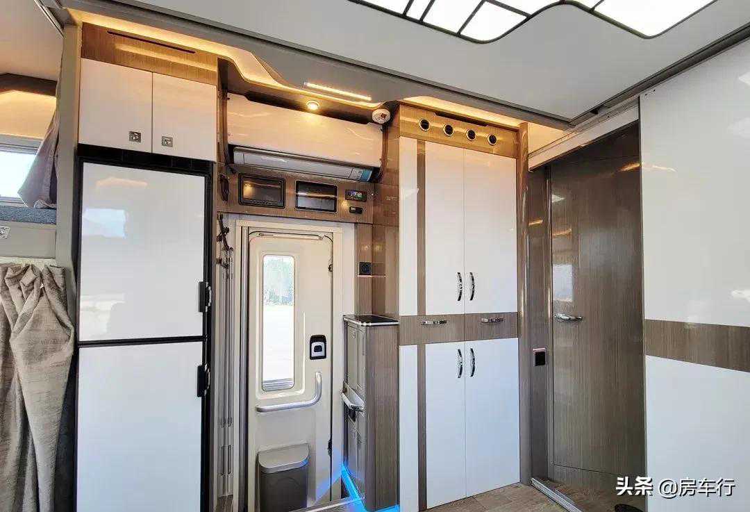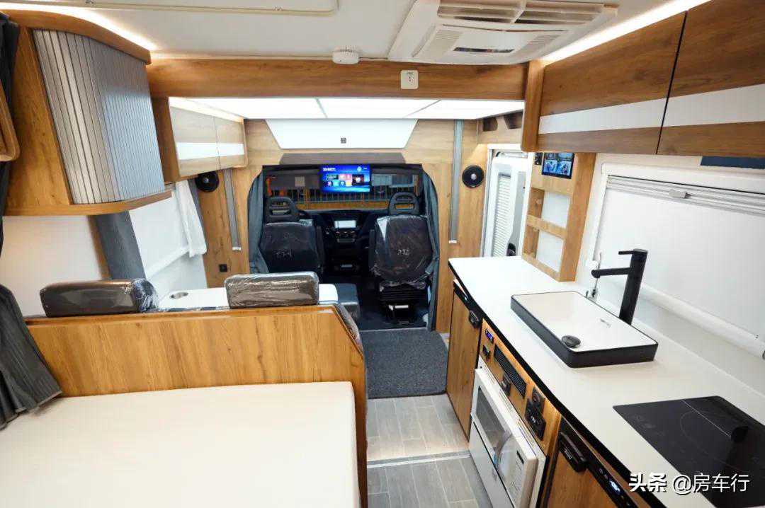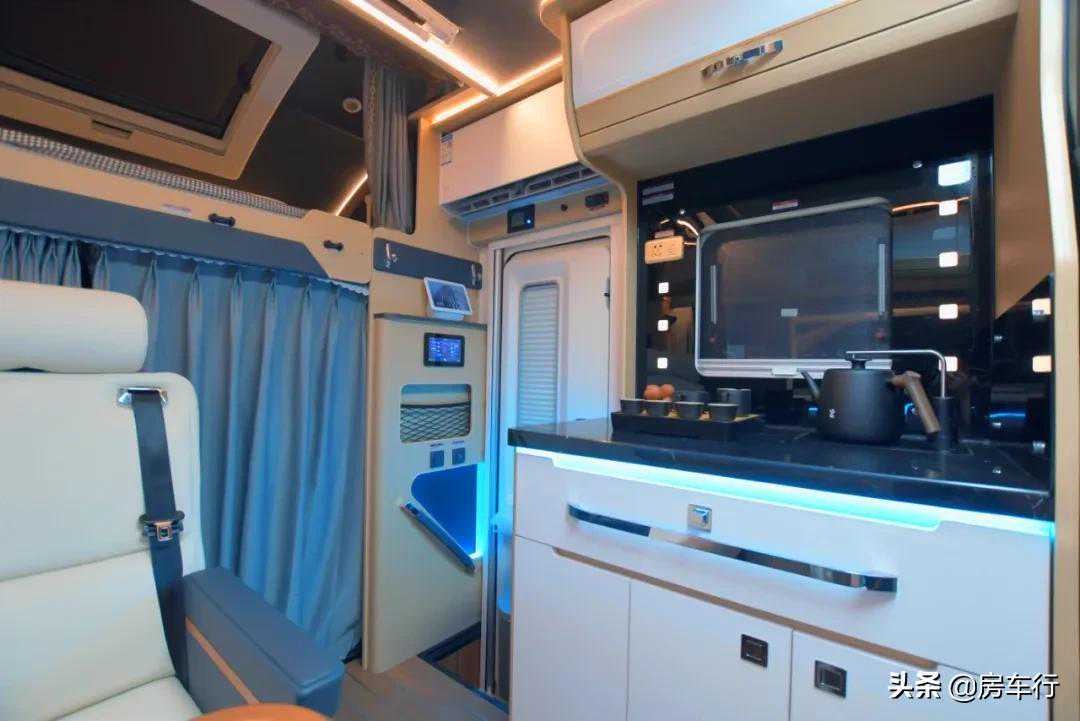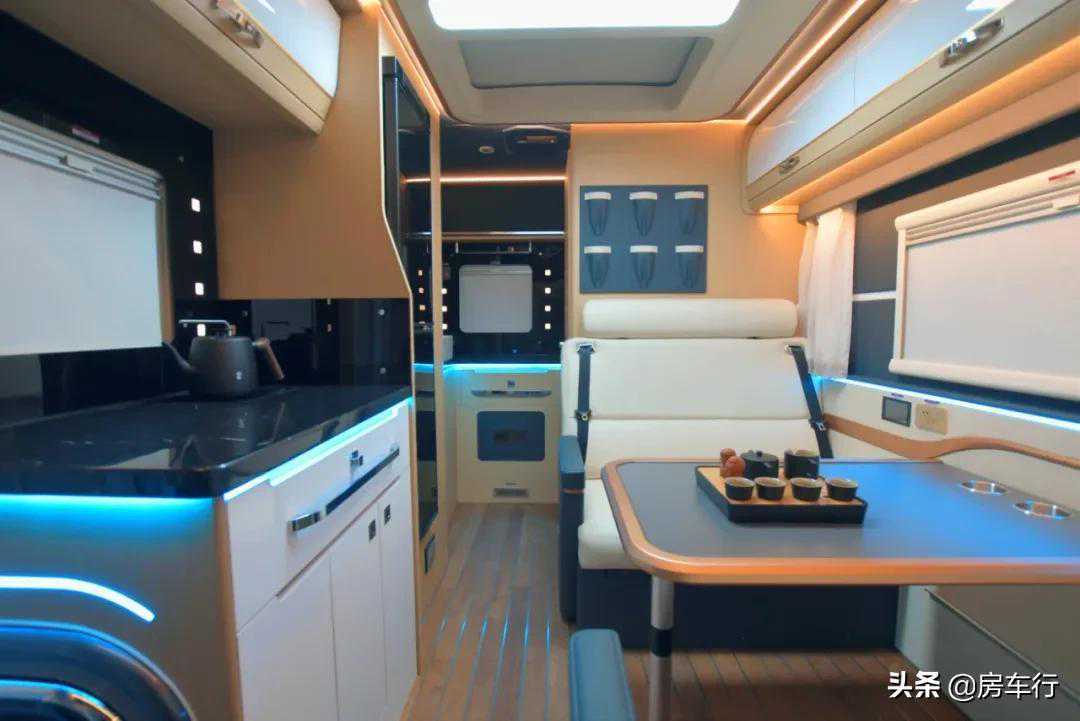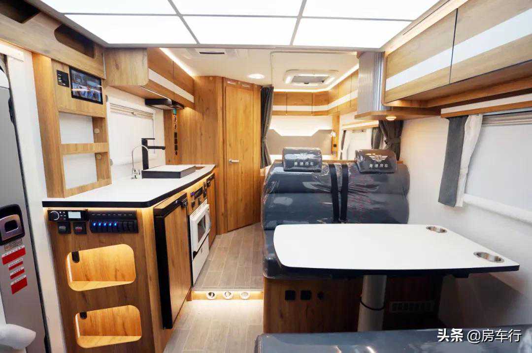 内饰整体偏向商务风,豪华家具、氛围灯带、顶灯,营造豪华商务办公氛围;额头处设有触屏电视以及丰富的储存空间;右侧厨房区配备了微波炉、电磁炉、洗手池、两台支持温度调节的英得尔电冰箱等,可以在车内进行简单的烹饪,也可搭配户外厨房使用;整车带有新风系统、直饮水系统,日常生活舒适性有保障;