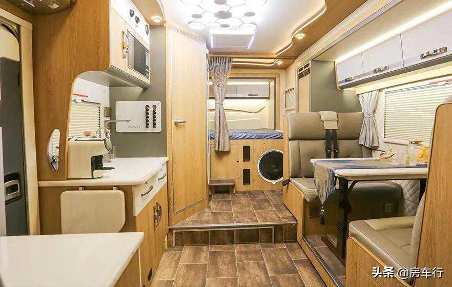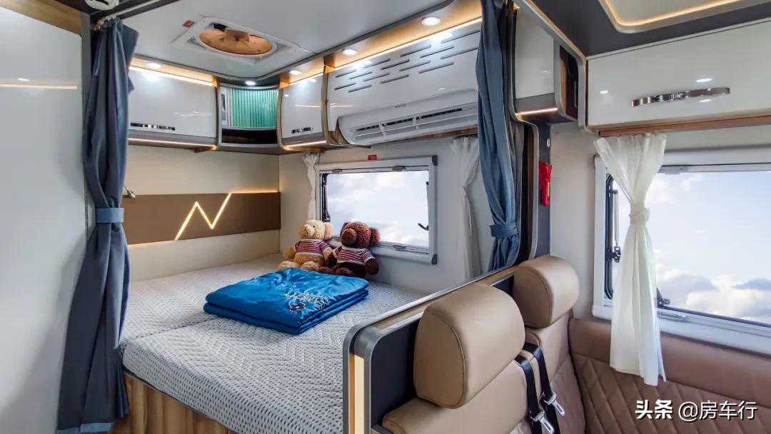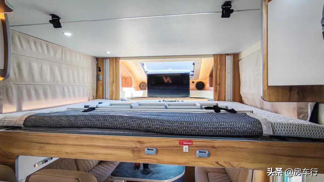 三层三明治结构车厢;车身外尺寸为5990x2540x3180mm,准载6人,蓝牌C照可驾驶;动力方面搭载3.0T柴油发动机,匹配8AT自动变速箱,额定功率134KW;整车配备前扭力杆+后空气悬挂系统,车身稳定性强;额头处搭载限高防碰撞系统;双拓展结构进一步增加内部生活空间;