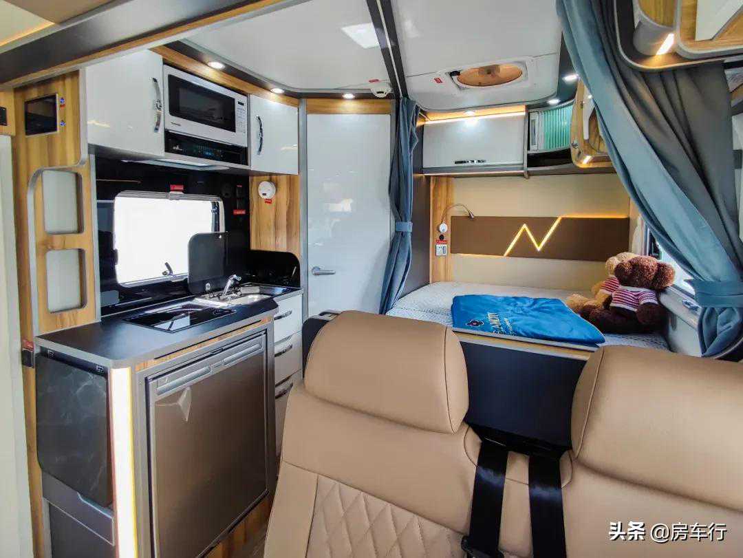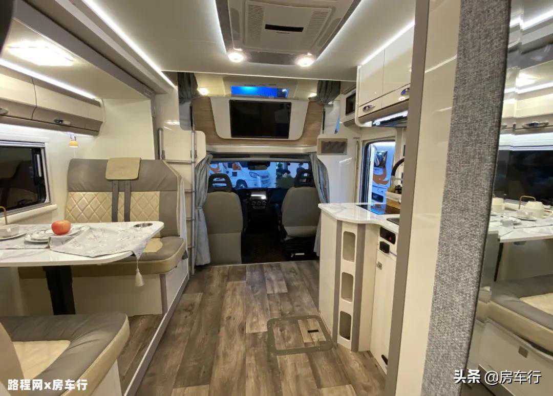 新车外尺寸为5983x2498x3130mm,符合国六标准,蓝牌C照可驾驶;动力方面搭载3.0T柴油发动机,匹配8AT变速箱,峰值扭矩430N·m;外部设有遮阳棚、置物板、驻车平衡支撑器、贯通式储物舱、户外厨房等;行车方面有牵引力控制陡坡缓降、电动加热加宽后视镜、双向调节多功能方向盘、电子助力转向、定速巡航、胎压监测、等辅助驾驶;