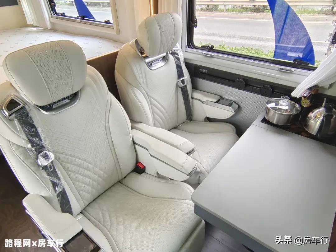 整车最大的亮点莫过于会客区的两张航空级商务座椅,座椅带有按摩、通风、加热等功能,可通过座椅扶手处的液晶屏幕控制操作,日常乘坐舒适度得到大幅提升;座椅前方餐桌设有电源接口,还有电茶炉方便加热茶水,办公、洽谈商务、休闲都有着满满的仪式感;