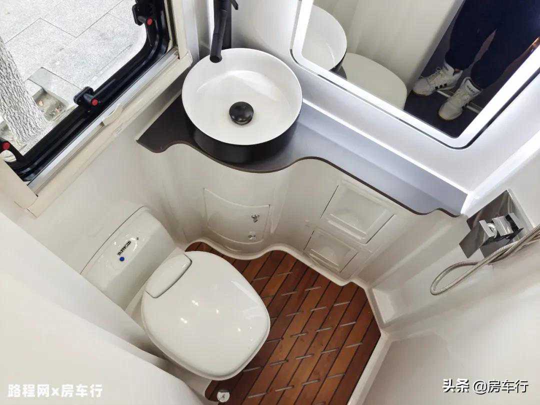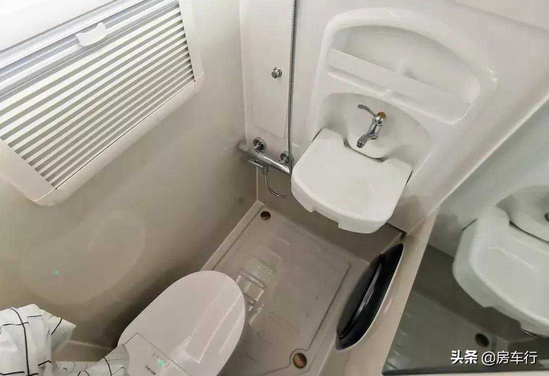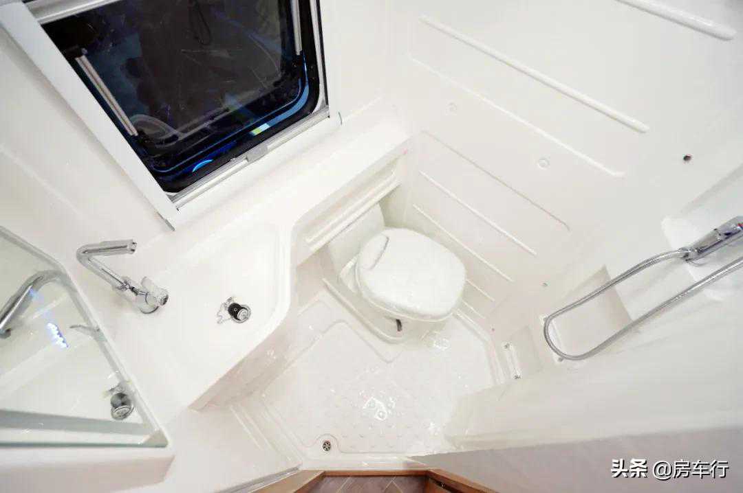 独立封闭式卫浴间做了干湿分离处理,内部配有洗漱池、房车专用盒式座便器、独立淋浴花洒、毛巾架、梳妆镜、浴帘、换气扇等设施;