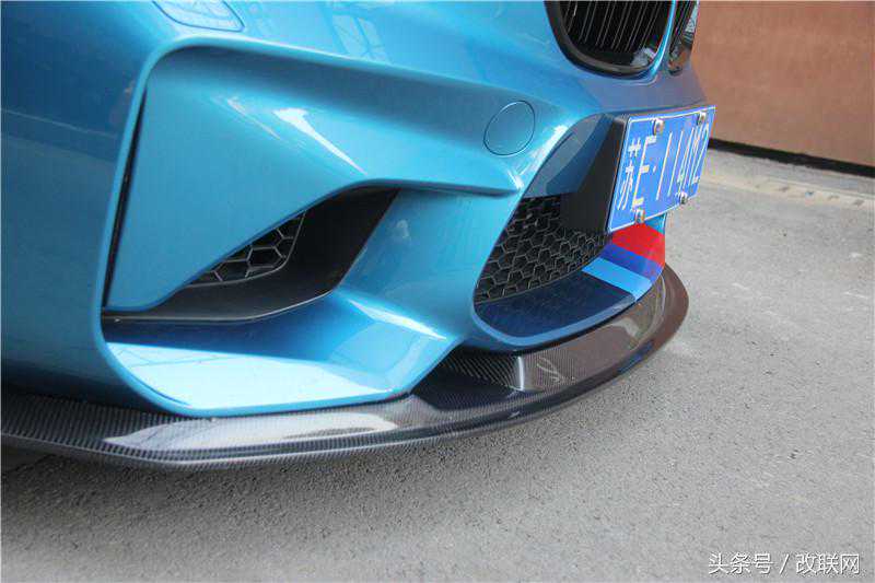 由于M2的车身尺寸要比1M更大,再加上整体造型的流线型进化,所以M2看上去并没有1M那么富有宽体感,但整体依旧饱满富有力量。这台蓝色的M2,保留了原厂的长滩蓝配色,在外观方面最吸引人的当属一系列空气动力学套件的加入,碳纤维的材质很轻同时颜值很高,可以说非常符合赛道的气息。同时,亮黑的中网取代了原厂的镀铬包边中网,对M2来说不需要那样来衬托自己,专注于性能的表现才是它的追求。大尾翼的设计虽然有点夸张,但为了获得高速下的稳定性,完全可以接受,毕竟把M2当买菜车有点屈才了。