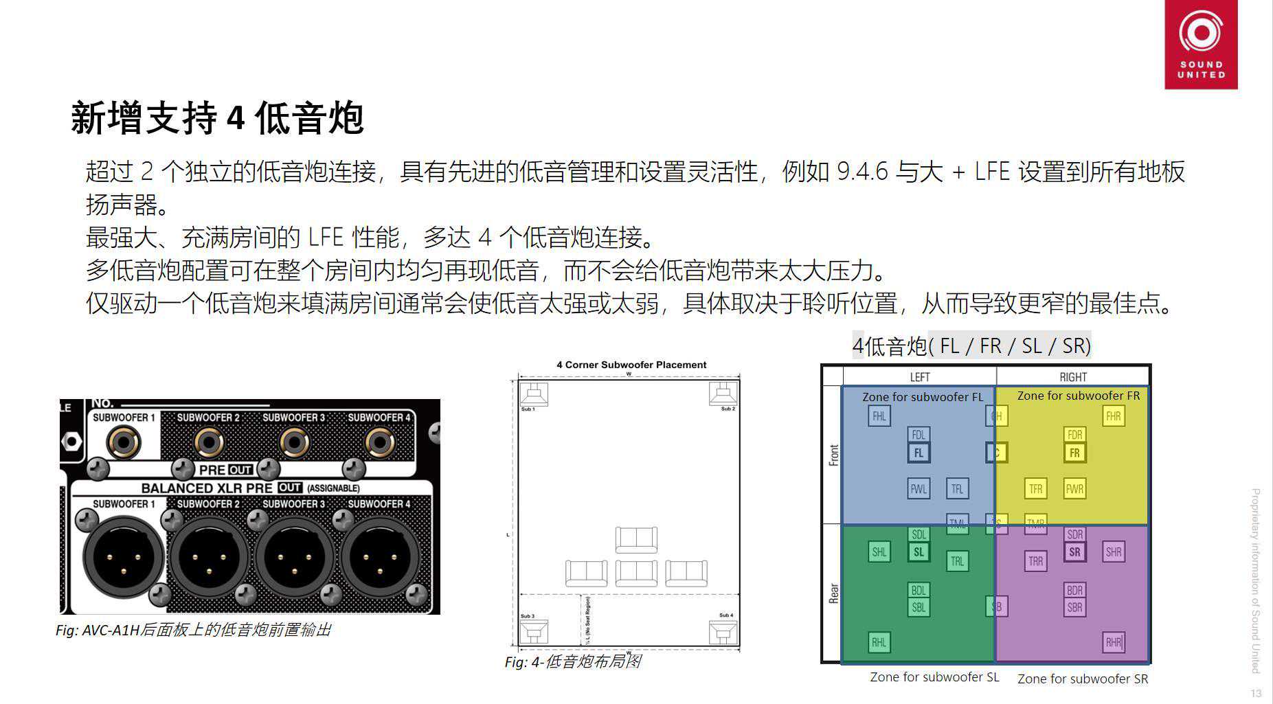 然后,低音炮也有四个通道,并且XLR和RCA接口都有。这四个接口也对应的新的用法。