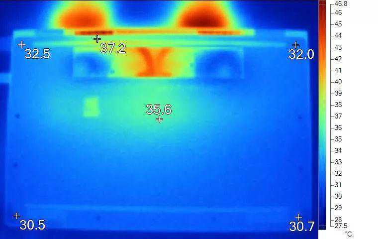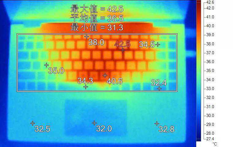 左右两风扇加上核心位置居中,使得键盘两侧温度能得到控制。同时背面温度让人眼前一亮,在高负载下底壳表面最高温度不超过40℃的轻薄本相当少见。