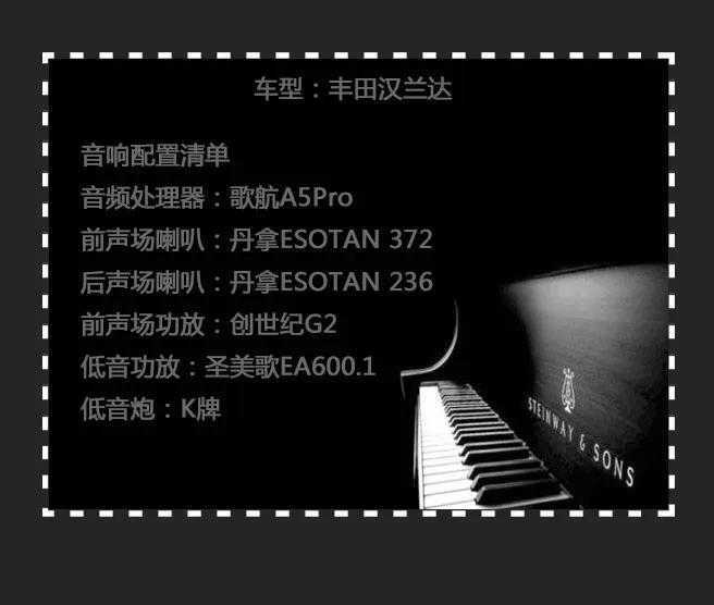 音乐是我们生活中不可缺少的一种调味品,尤其是对于经常的人士来说,音乐更是途中必不可少的。不过,好的音乐需要好的音响才能发挥它最大的魅力,所以很多喜爱音乐的车友都将原车质量一般的音响升级为一套自己满意的音响,将音乐的魅力完全发挥出来。而今天所讲的丰田汉兰达车主是一位发烧友。我们改装技师根据车主的听音要求定制出一套丹拿搭配创世纪、K牌配上圣美歌,再用歌航A5进行解析的发烧级别配置,让车主可以感受到不一样的音乐味道,接下来给大家分享一下这辆丰田汉兰达的音响改装过程。