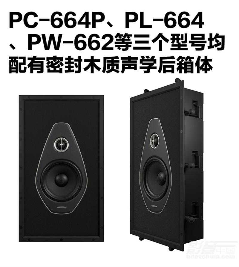 PC-664P、PL-664、PW-662等三个型号均配有密封木质声学后箱体,用于需要作背板隔音的设计。PC-664P吸顶式音箱,与PL-664音箱使用相同配置的喇叭单元,主要的应用就是家庭影院音频系统里面的天空声道音箱。很显然,SonusFaber的目的为客户提供一套完善的高品质三维沉浸式环绕声音响系统。