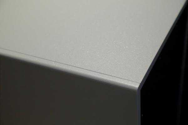 作为Alumine系列的老大哥,Alumine5的份量十足,单支音箱就重达100公斤。很大部分的重量来自那个全铝合金的箱体,每一块铝合金板足有1公分厚,由瑞士的专业金属加工厂制作,每一片铝板的误差最多最多也不超过0.1mm,也就是误差不超过一根头发的直径。板材均经过阳极处理,表面呈现喷沙质感。两侧还有磁吸饰条,用家更可更换不同颜色的饰条来变换心情。瑞士金属加工和精致工业闻名于世,体现在Hi音响上,每每让人叹为观止;Stenheim音箱也是这样,在极简之中,展现精微奥意。