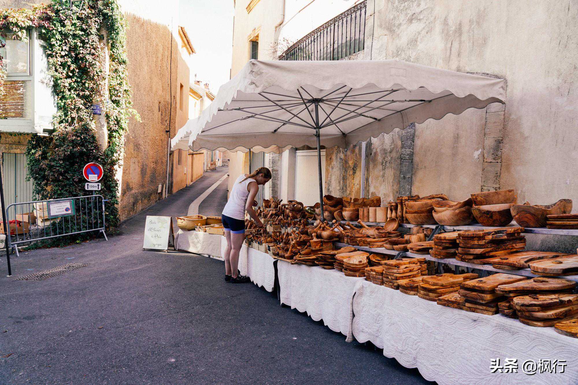 恰逢周五,小镇山脚下平坦的道路上,聚集了很多市集摊位。出售在普罗旺斯最最普通的商品,香肠、橄榄、奶酪、丝巾。