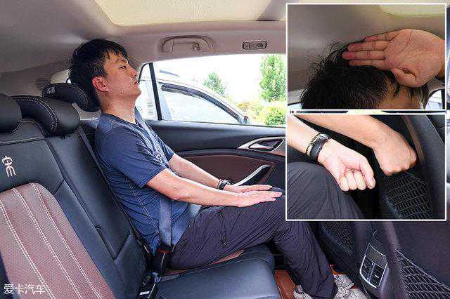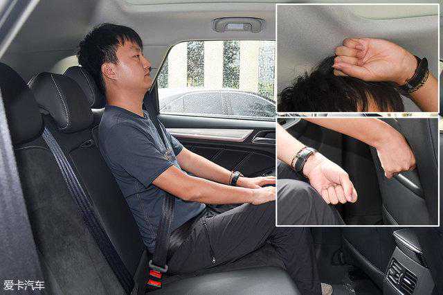 前排座椅位置不变,同一体验者坐入后排,头部空间剩余1拳,腿部空间剩余3拳以上。