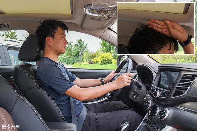 身高1.76m的体验者坐入前排,将座椅位置调至最低,头部空间剩余1拳。