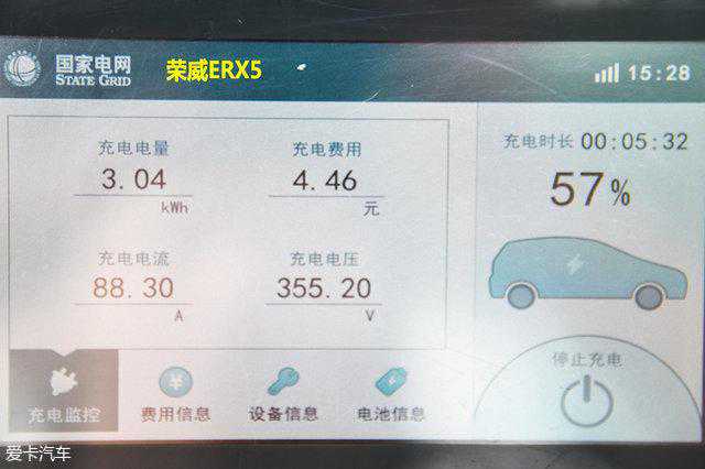 测试中,荣威ERX5的充电电压在355V左右,电流88A左右,充电功率约31.4kW。