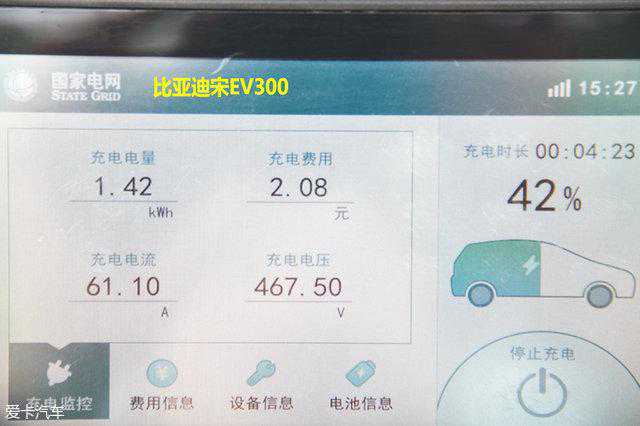 测试中,比亚迪宋EV300的充电电压在467V左右,电流61A左右,充电功率约28.6kW。