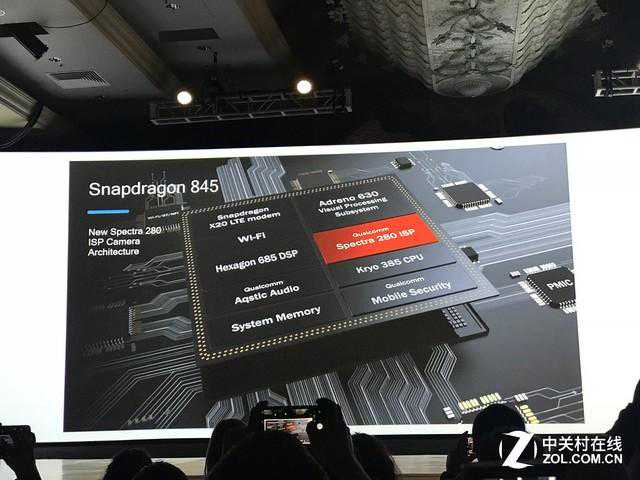骁龙845移动平台主要升级部分:全新的QualcommKryo385CPU,性能提升25%,全新的Adreno630GPU,性能提升30%、功耗降低30%;集成X20LTE调制解调器,第二代千兆级LTEModem(下行最高1.2Ghz),相比第一代产品X16速度提升20%;全新Hexagon685DSP,提供人工智能技术,全新的QualcommSpectra280ISP,提供更全面的拍照功能。