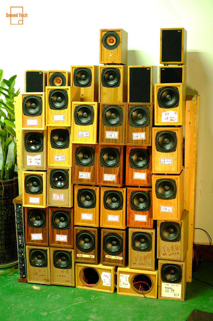 但是,MC14的那只喇叭并非样子货。声技为这只喇叭单元的改进花费了二年多的时候,MC13的原型箱就是用的这只木振膜,但声技老大一直不满意,后面又改成3寸的木振膜再来,然后不满意改成现在的单元。下面这一堆是MC13、14研发时的炮灰。但声技一直没有放弃这只4寸木振膜,据说这只单元的中频让人非常满意,差的只是高频和瞬态。为此更改过很多版本,最后的版本声技很满意。这只喇叭单元也有用于出口,被一个国外音箱品牌做成了一只售价6000人民帀的全频音箱。