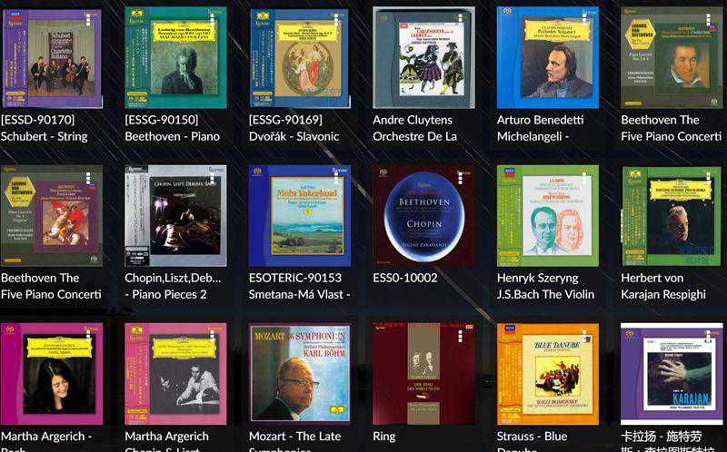 9028就是给力,MC14立刻像换了一只箱子一样。整个声音立刻沉稳了起了,三频都清晰了。低频也基本不浑了。最大的改善是中高频,在播放DSD音质的古典音乐时,MC14呈现了一种很优雅的气质,中高频相当细腻迷人。不管是声技老板,还是门耳朵,都是资深的古典音乐发烧友。有技术又同时是音乐爱好者们在制作器材一定会对自己的路子。喜欢周杰伦的人做出适合播放古典音乐的器材来,这种事就是纯搞笑。而人声也因此有了更有几分韵味。手机播放器也好用,打开界面,看着一排排的整齐CD封面,顿时有了当皇帝每晚都可以临幸新人的幸福感觉,呵呵