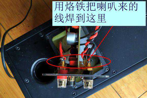 然后小编就动了手,把声技MC14改成了无源。其实挺简单的,用4mm的内六角扳手打开后盖,然后用电烙铁焊下电路板上面那两根接喇叭的线,再焊到背板的原来输出到左音箱的柱上,就搞定了。这样原输出到左音箱的输出柱变成功放输入了,MC14也就秒变为无源音箱了。