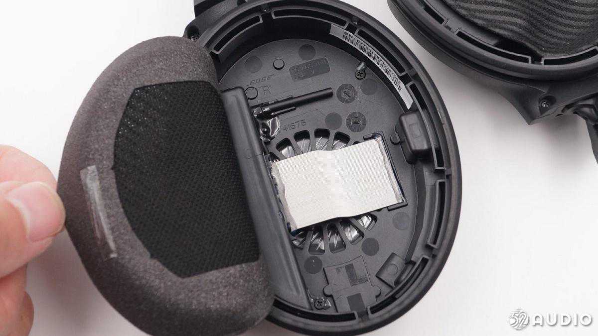 然后揭开右侧耳罩基布(基布是盖住和保护耳机内主件的内侧隔布)。