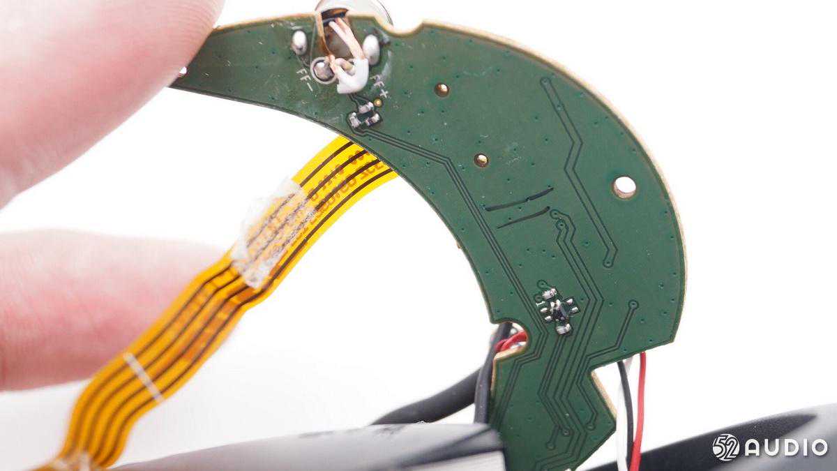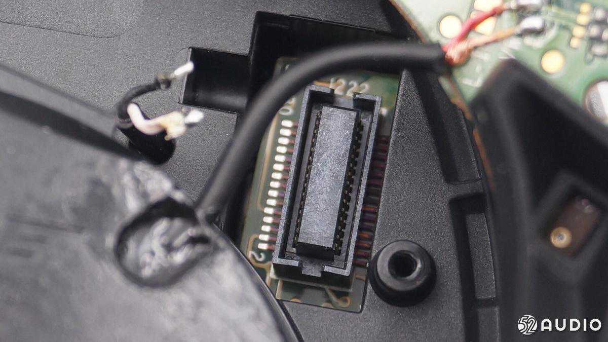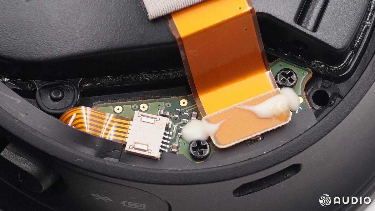 排线通过双面胶固定在扬声器音腔上,连接端口小板和耳机主板。