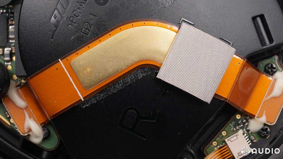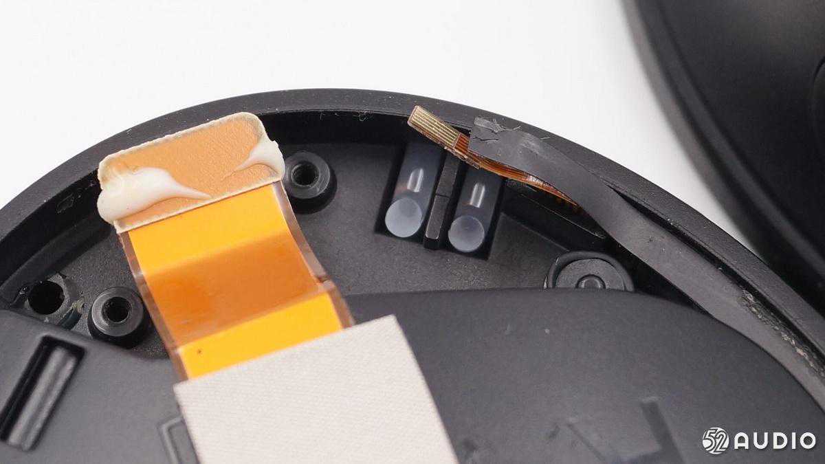 左侧的耳机内部是电池仓,下面可以看到单元振膜的纹路。
