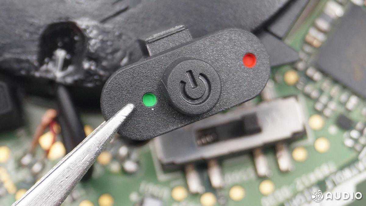 电源/蓝牙开关按钮钮帽特写,用红绿色点标记出耳机开关状态。