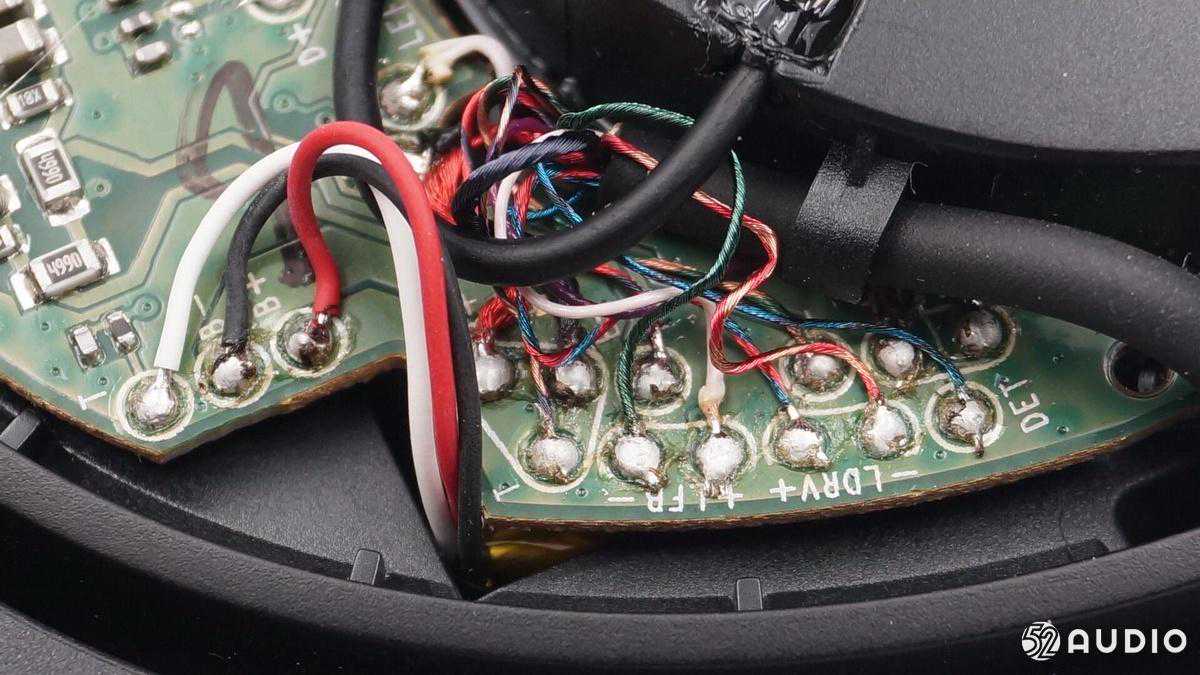 这块电路板上焊接着电池和音频输入以及连接到另外一只耳机的连线。